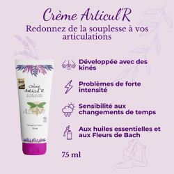 La crème certifiée bio Articul'R a été mise au point à la demande de kinésithérapeutes en complément de la crème de massage Muscul’R. Cette crème naturelle cible les problèmes de plus forte intensité, et qui peuvent varier à cause de facteurs extérieurs (temps par exemple). Sa texture fondante et non grasse permet une pénétration rapide. Sa composition unique redonne de la souplesse aux articulations grâce aux huiles essentielles et aux élixirs floraux (Fleurs de Bach).